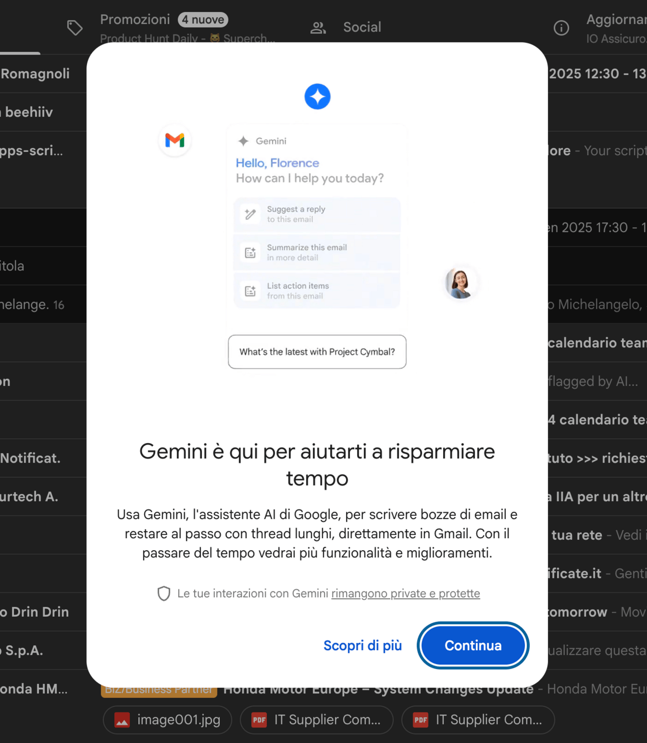 L’altro ieri (giovedi…) aprendo lo strumento di lavoro che usiamo quotidianamente, la nostra Gmail aziendale, è apparsa una novità importante: Google in modo inaspettato ha rilasciato gratuitamente a tutti gli utenti con un account aziendale di Gmail (il pacchetto Google Workspace, l’alterego e eterno rivale della suite Outlook di Microsoft) l’ultima versione del tool di Intelligenza Artificiale Gemini 2.0.