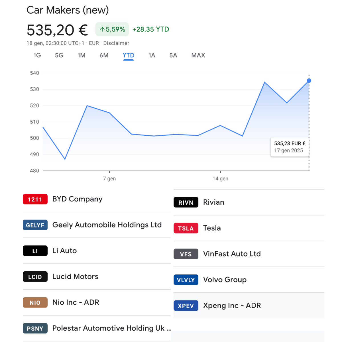 In questa sezione ho creato due portafogli con i titoli delle case auto tradizionali e di quelle nuove (EV e cinesi) con l’andamento dell’anno in corso (proviamo così, mi dirai se ha senso o meno).