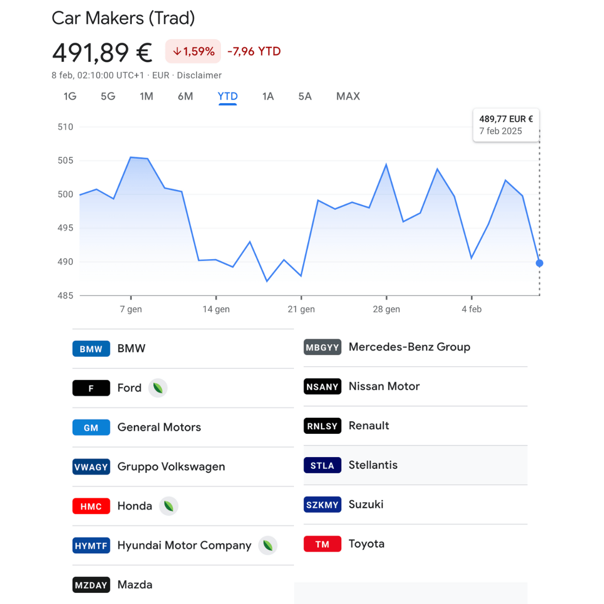 In questa sezione ho creato due portafogli con i titoli delle case auto tradizionali e di quelle nuove (EV e cinesi) con lโandamento dellโanno in corso (proviamo cosรฌ, mi dirai se ha senso o meno).