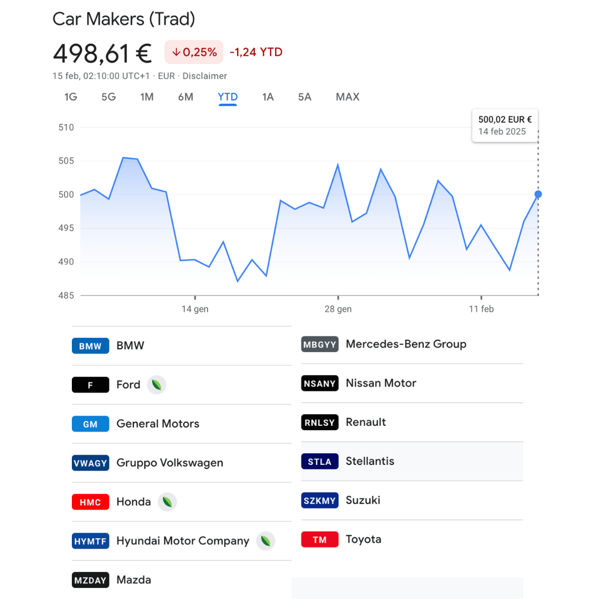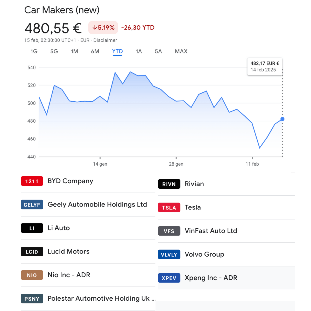 In questa sezione ho creato due portafogli con i titoli delle case auto tradizionali e di quelle nuove (EV e cinesi) con lโandamento dellโanno in corso (proviamo cosรฌ, mi dirai se ha senso o meno).