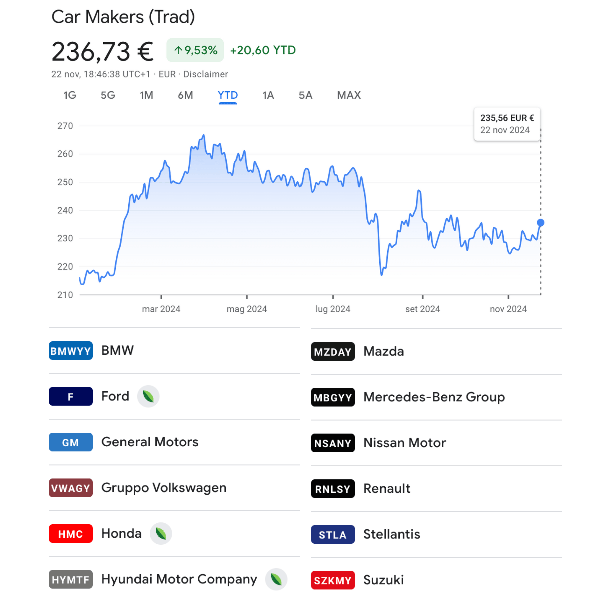 In questa sezione ho creato due portafogli con i titoli delle case auto tradizionali e di quelle nuove (EV e cinesi) con l’andamento dell’anno in corso (proviamo così, mi dirai se ha senso o meno).