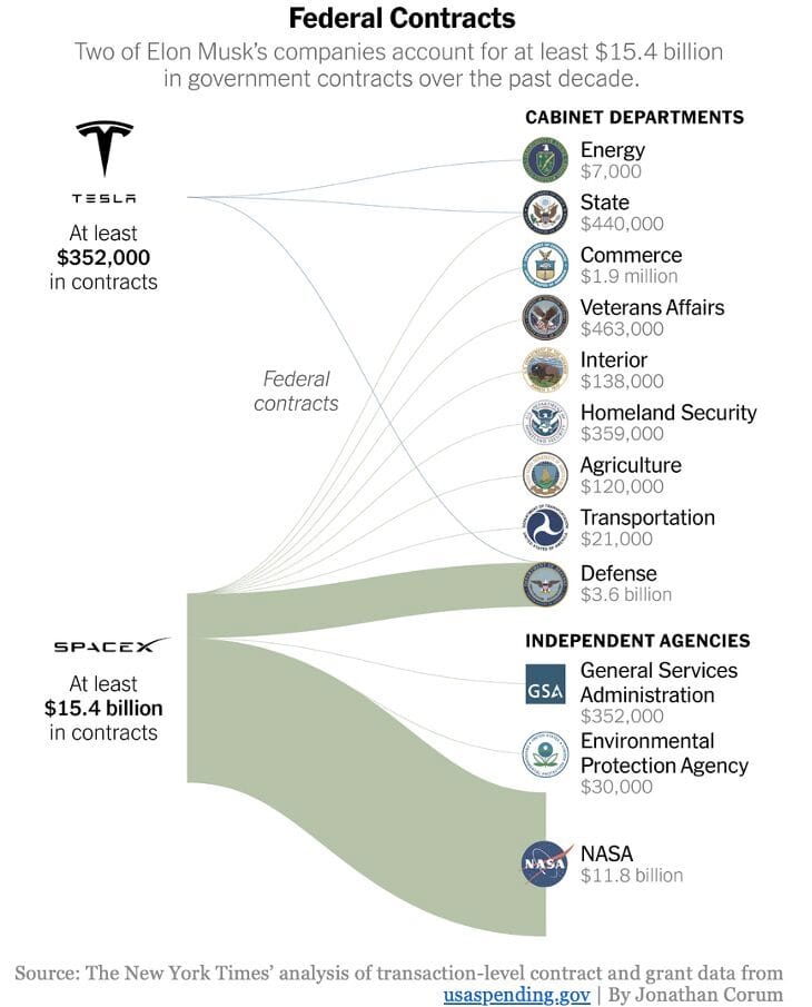 La compagnia missilistica di Musk, SpaceX, detta efficacemente il programma di lancio dei razzi della NASA. La United States Department of Defense si affida a lui per portare in orbita la maggior parte dei suoi satelliti. L'anno scorso alle sue aziende sono stati promessi 3 miliardi di dollari in quasi 100 diversi contratti con 17 agenzie federali.